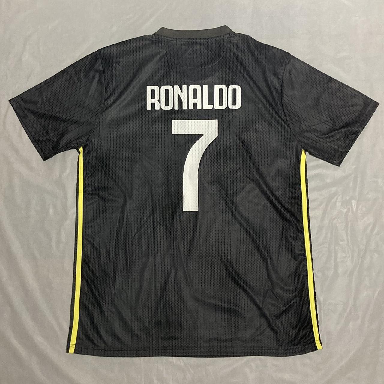 Adidas Juventus 2018/19 Third Jersey – Ronaldo #7 Available in sizes Large and Extra Large black jersey, Juventus football, soccer kit, Ronaldo number 7, 2018/19 third shirt, sports jersey, team apparel, athletic wear, matchday kit, football fan gear