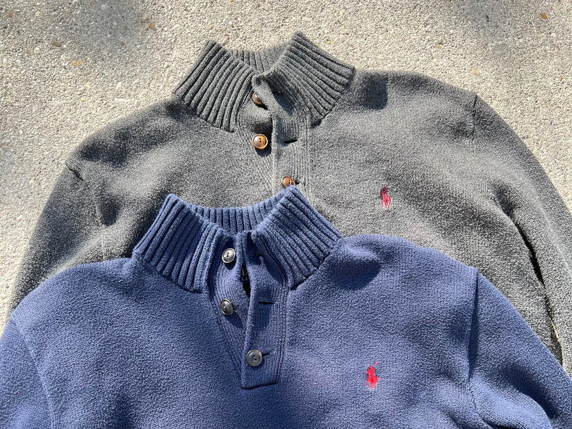 A selection of branded sweaters. The sweaters can be round neck, v-neck, quarter zip, full zip or other styles. They may be unicolor or striped. This bundle comes in different colors, styles and sizes. Brands mostly include Chaps, Tommy, Nautica, Lauren and other brands.