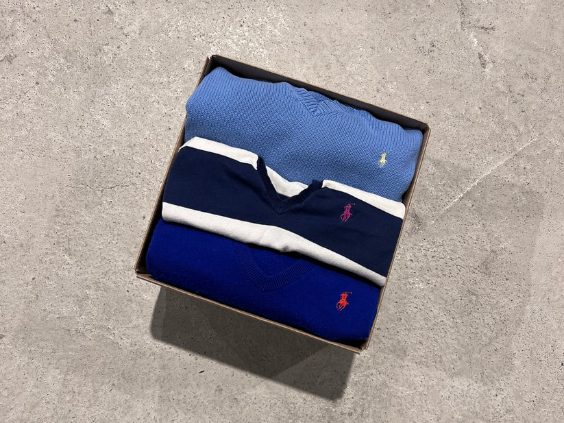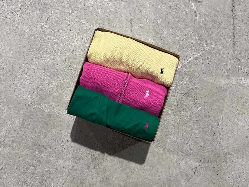 A great selection of Ralph Lauren sweaters. The sweaters may be unicolor, striped or with details. This bundle comes in different colors, styles and sizes.