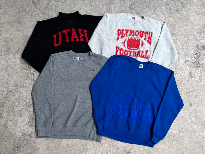 This bundle contains Russell sweatshirts. The sweatshirts are both plain and with prints as you can see on the pictures above. They are mostly made in USA, Mexico, and Honduras.